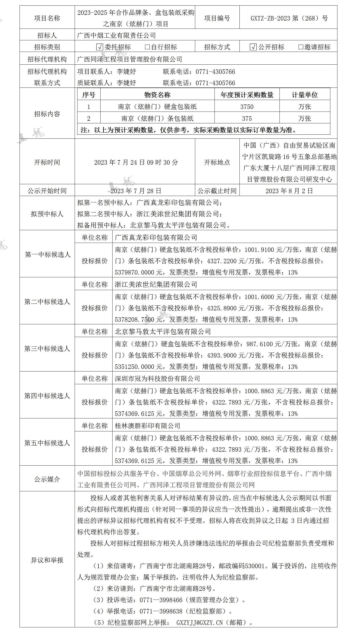 廣西中煙工業(yè)有限責(zé)任公司2023-2025年合作品牌條、盒包裝紙采購之南京(炫赫門)項(xiàng)目(項(xiàng)目編號(hào):GXTZ-ZB-2023第(268)號(hào))中標(biāo)候選人公示